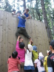 お昼を食べたら、いよいよ3mの壁に挑戦します。 足場も取っ手もない、ただの壁。どうやったら乗り越えられるか・・・ 参加したメンバー全員で力を合わせて、取り組みます。 登りきった後は、みんな大満足の笑顔が広がります