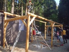 この日は、テーブルやベンチを設置し、かまどの屋根やテントシートを設置します。