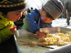 餅つきで今年のスタートです。 お母さんといっしょに杵を持ち上げて、よいしょ!よいしょ!おいしいお餅にな~れ! きなこやあんこでおいしくいただきましょう。