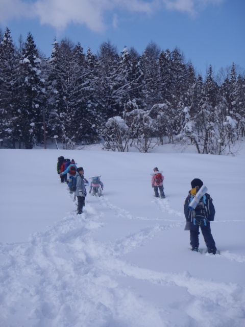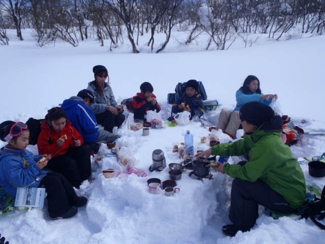 坪岳池を目的地にコンパスと地図を頼りに歩きます。到着したら、雪のテーブルを作ってランチ。あったかいスープが楽しみです。