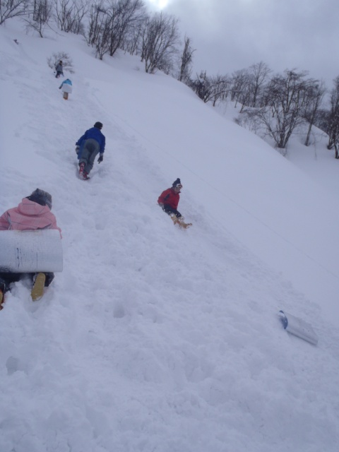 最後は雪山の斜面で大穴ぞり大会。肥料袋をそりに、迫力満点です。